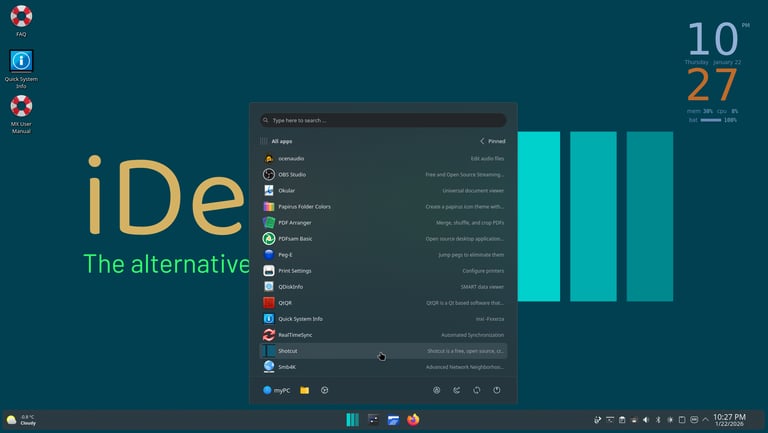 © 2024-2026 iDeal OS - The name “MX Linux” is covered by Linux Foundation Sublicense No. 20140605-0483. - Linux® is the registered trademark of Linus Torvalds in the U.S. and other countries.
